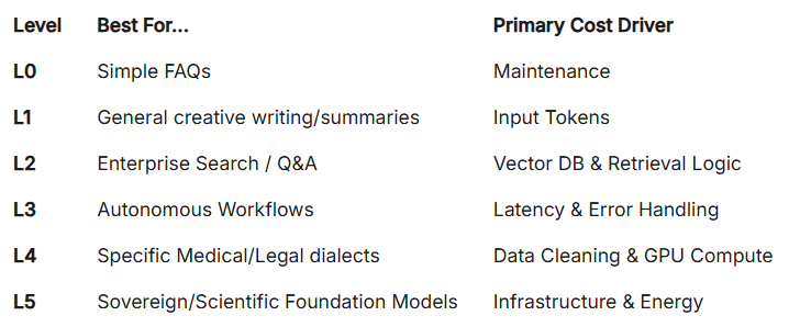 Implementing LLMs in production isn’t a binary choice between “using ChatGPT” and “building your own model.” It is a spectrum of complexity. Below, we break down the 0 to 5 maturity model for GenAI applications, analyzing the trade-offs between cost, quality, and engineering effort.